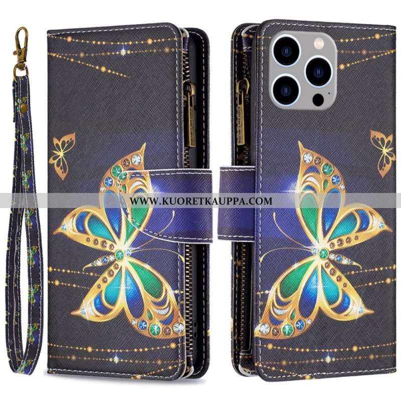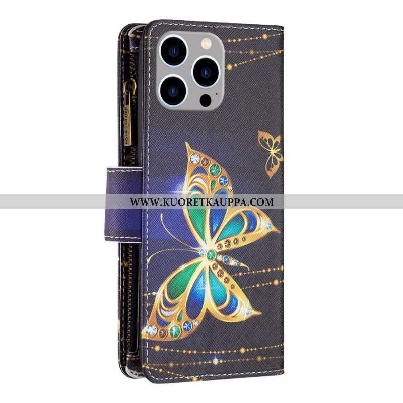 Flip Case iPhone 14 Pro Max Perhosten Vetoketjullinen Tasku