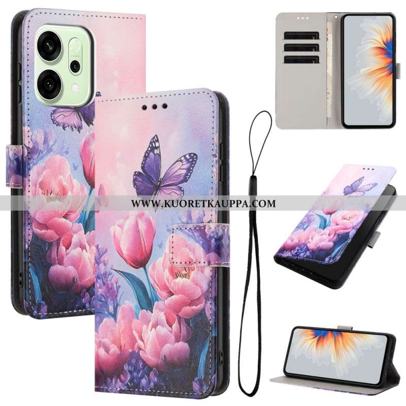 Nahkakotelo Oppo Reno 14 5g Kukkakuvio Hihnalla