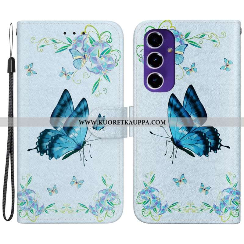 Kotelot Samsung Galaxy S24 Fe Sininen Perhonen Ja Kukkia Hihnalla Suojakuori