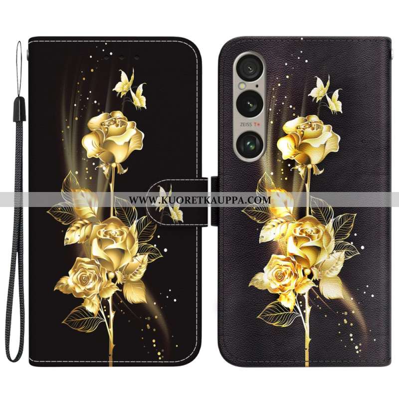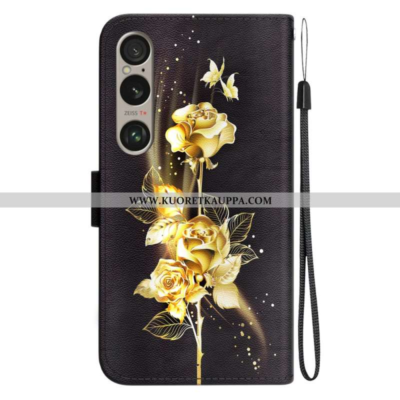 Kotelot Sony Xperia 1 Vi Puhelinkuoret Kultaisia Perhosia Ja Ruusuja Hihnalla