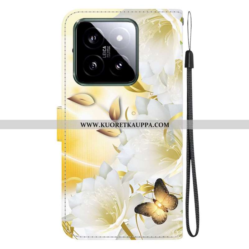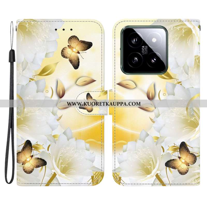 Kotelot Xiaomi 14 Kultaisia Perhosia Ja Valkoisia Kukkia Hihnalla
