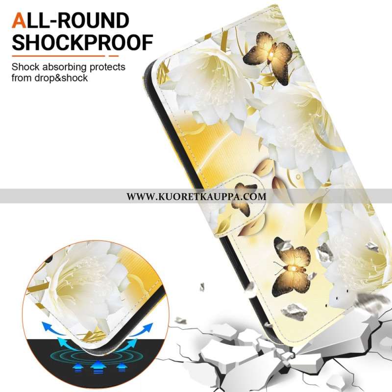 Kotelot Xiaomi 15 Pro Kultaisia Perhosia Ja Valkoisia Kukkia
