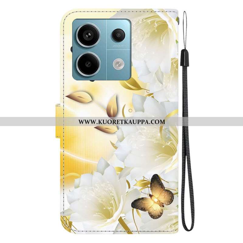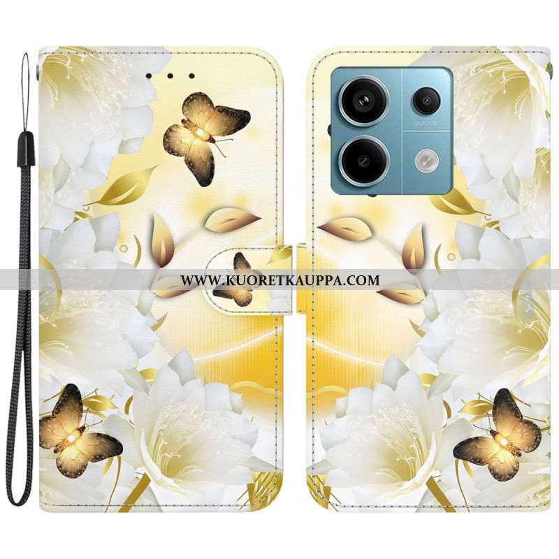 Kotelot Xiaomi Redmi Note 13 Pro 5g Kultaisia Perhosia Ja Valkoisia Kukkia Hihnalla Suojakuori