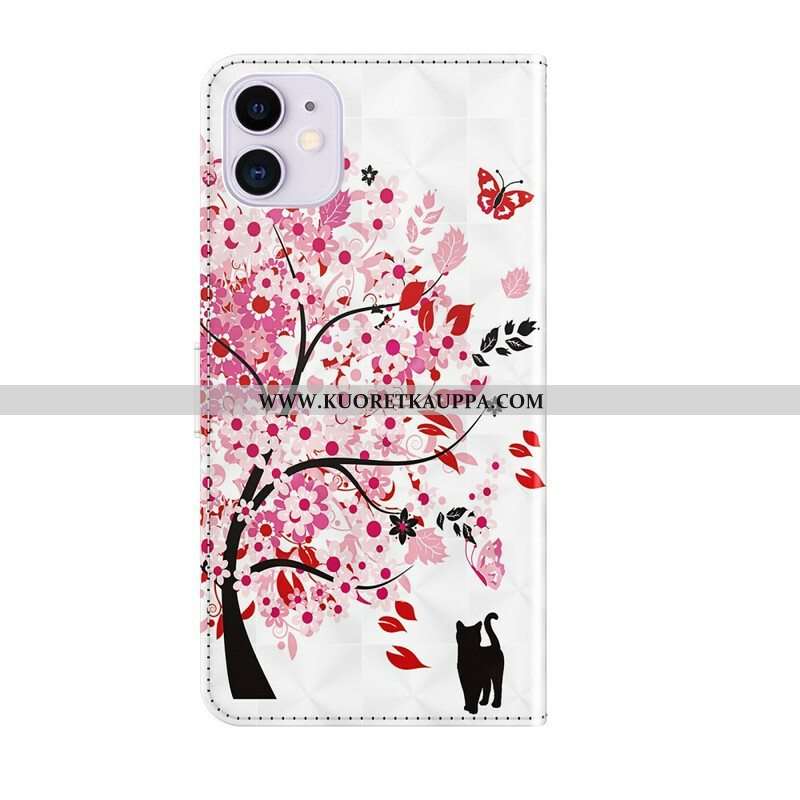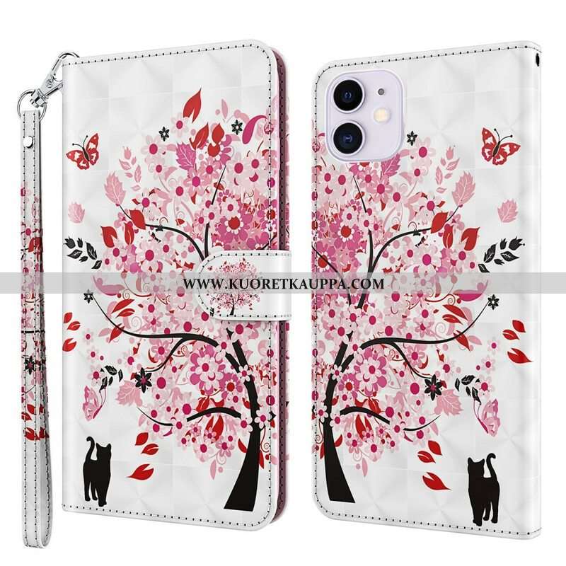Kotelot iPhone 13 Mini Vaaleanpunainen Puu Ja Musta Kissa