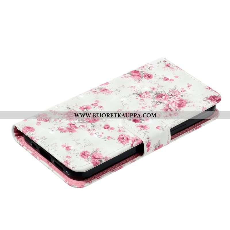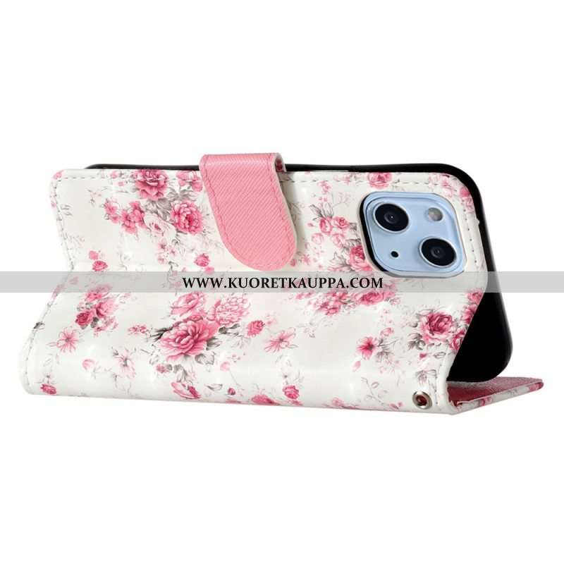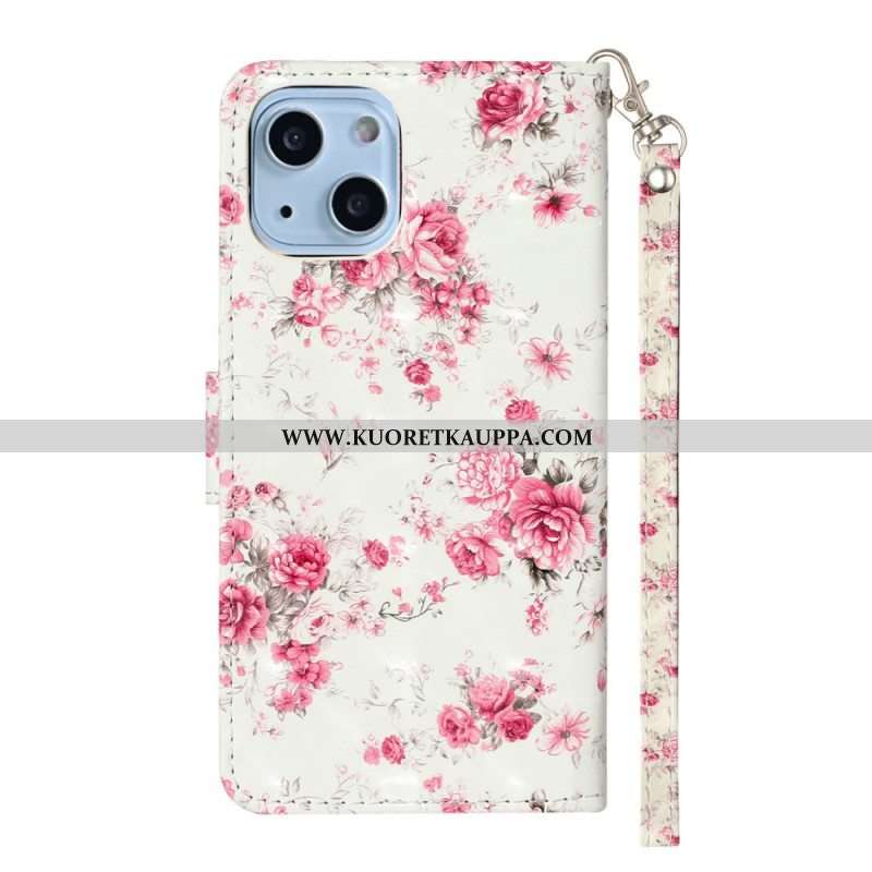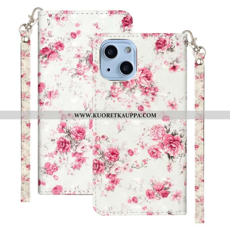 Nahkakotelo iPhone 15 Plus Suojaketju Kuori Valkoisia Kukkia Hihnalla