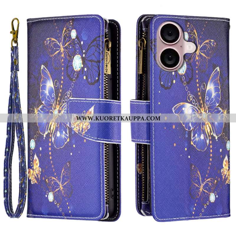 Kotelot iPhone 16 Plus Purple Butterflies -lompakko Hihnalla