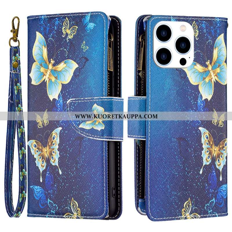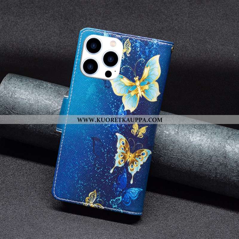 Kotelot iPhone 16 Pro Max Sinikultaiset Perhoset Hihnalla