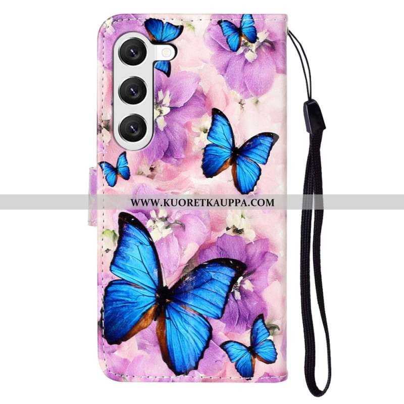 Kuoret Samsung Galaxy S24 5g Purppuraisia Kukkia Ja Perhosia Hihnalla