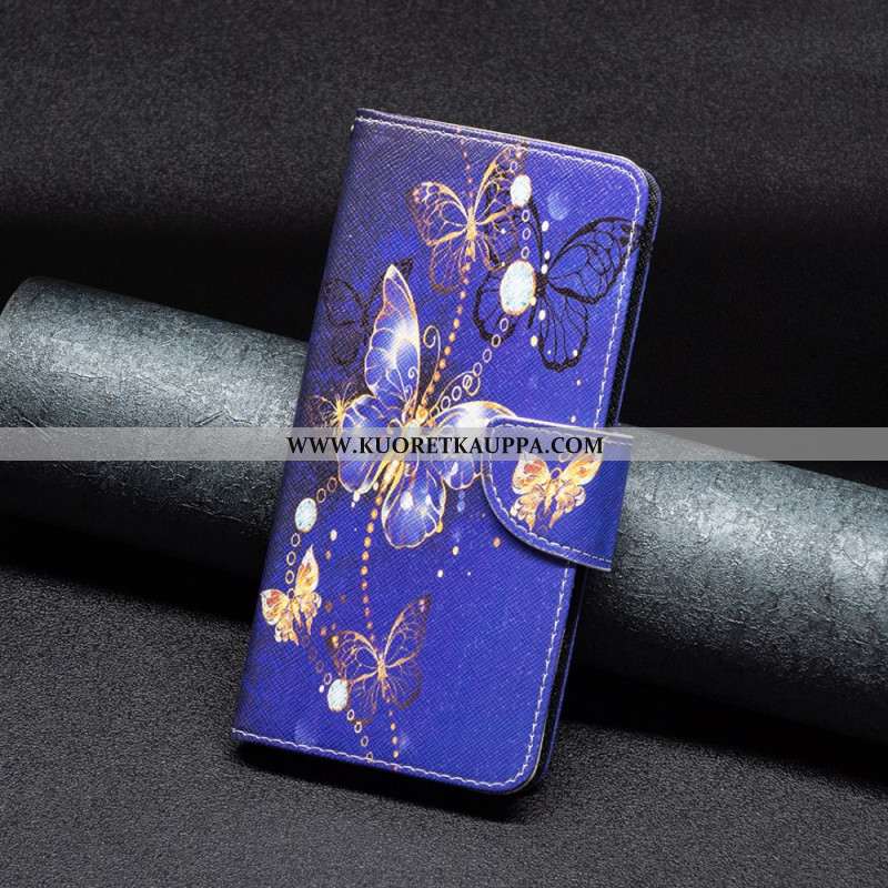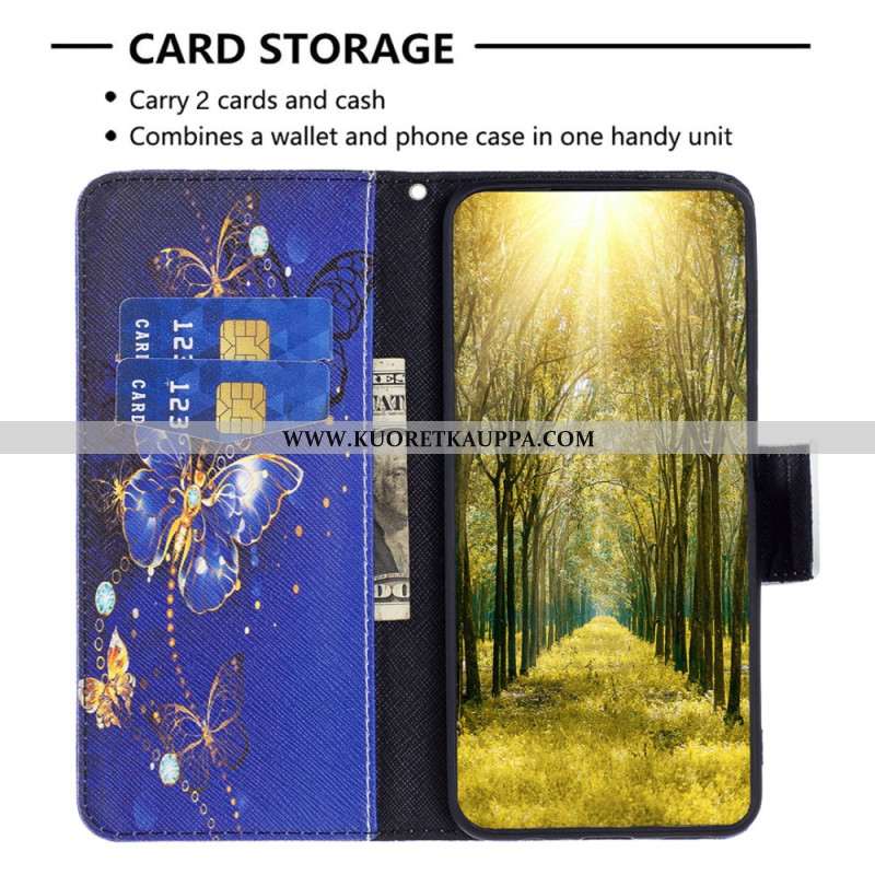 Kotelot iPhone 16 Plus Golden Butterflies -lompakko Hihnalla Suojakuori