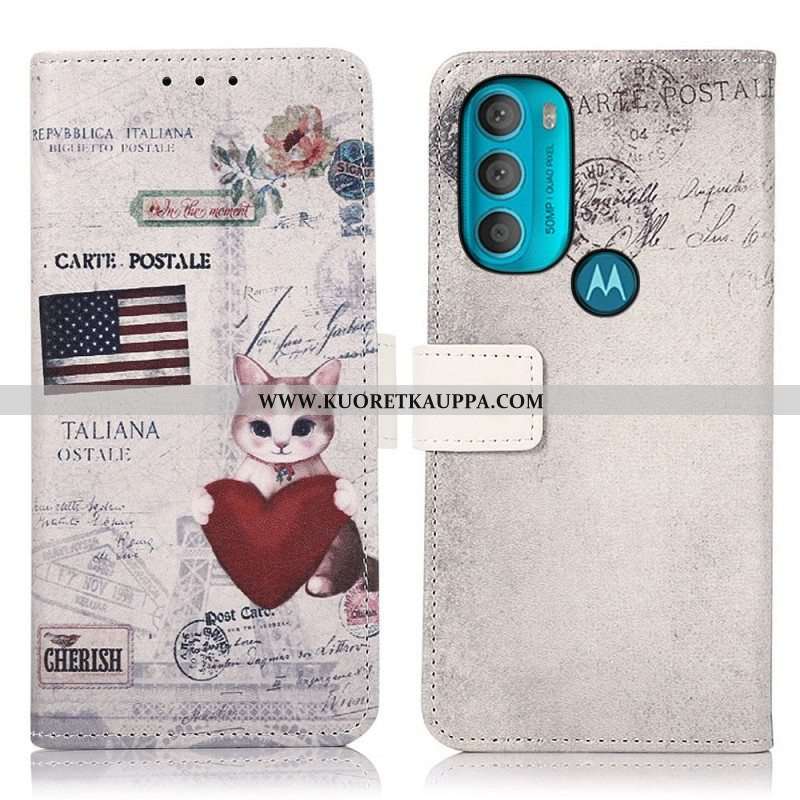 Nahkakotelo Moto G71 5G Traveller Cat
