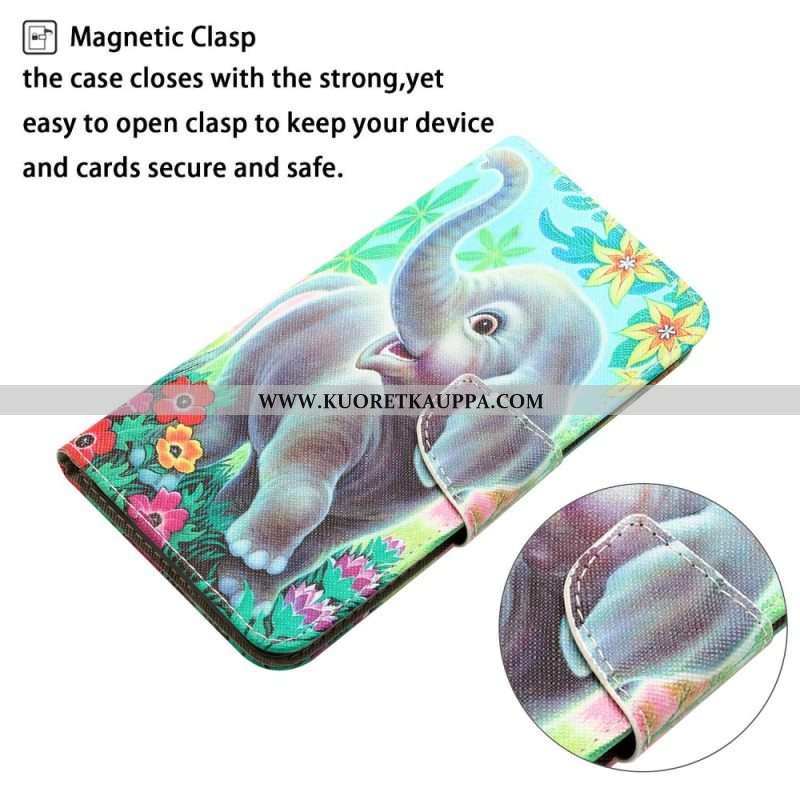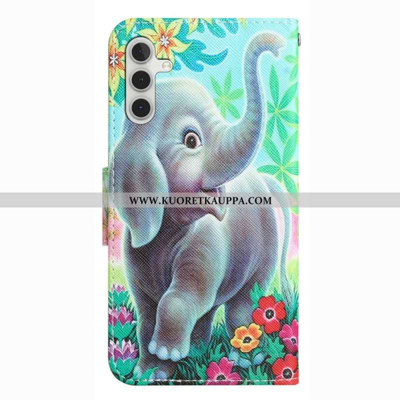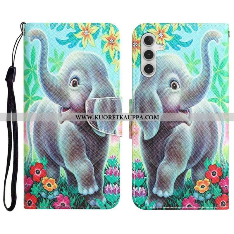 Nahkakotelo Samsung Galaxy A14 / A14 5G Suojaketju Kuori Iloinen Elefantti Kaulanauhalla