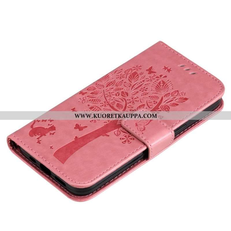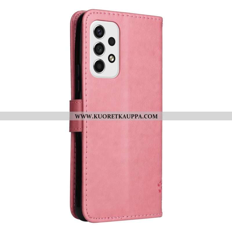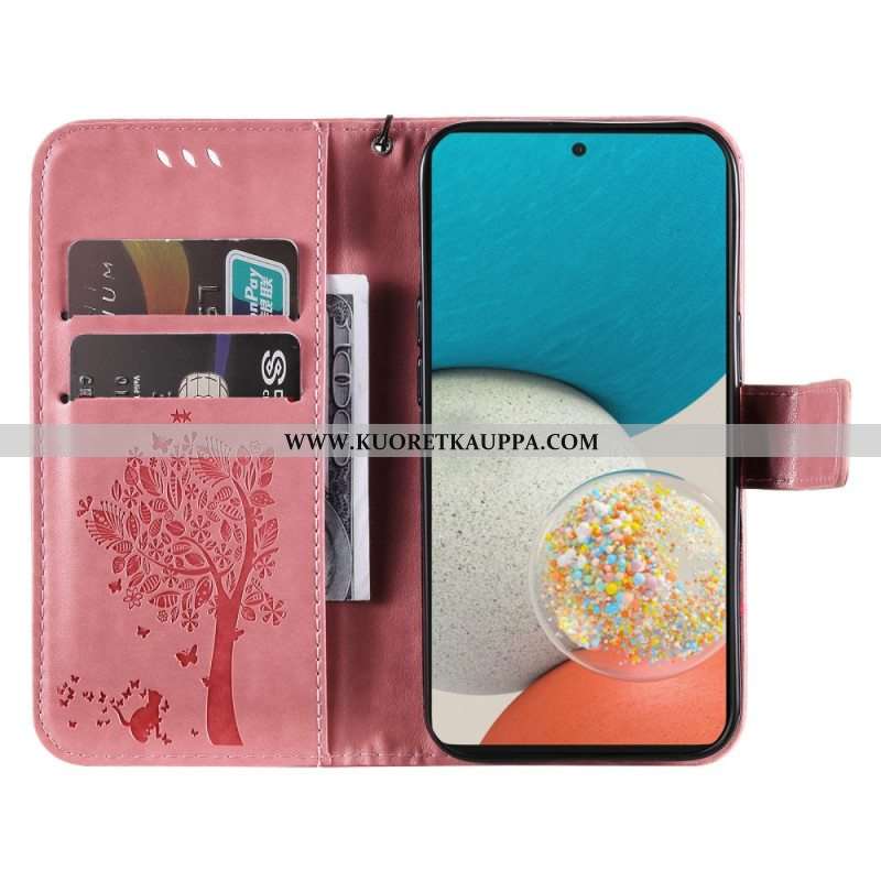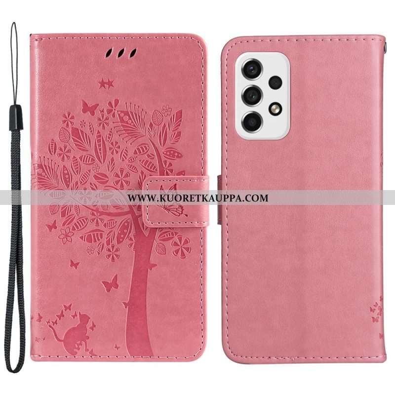 Nahkakotelo Samsung Galaxy A53 5G Suojaketju Kuori Tree Ja Strappy Cat
