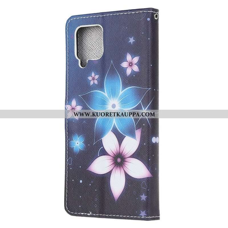 Nahkakotelo Samsung Galaxy M12 / A12 Suojaketju Kuori Kuun Hihnan Kukat