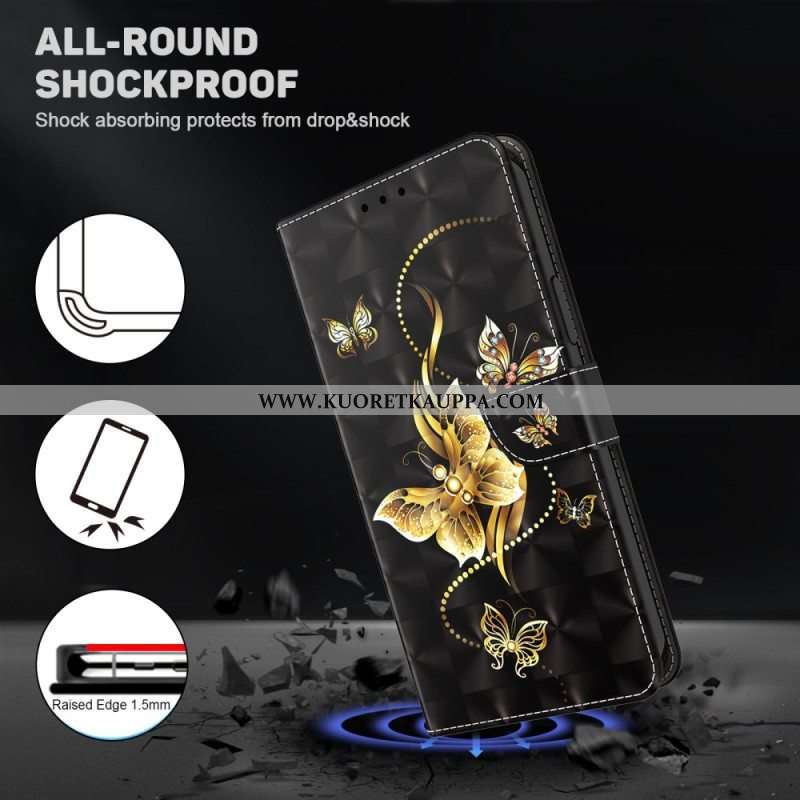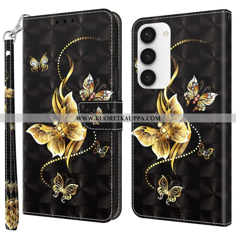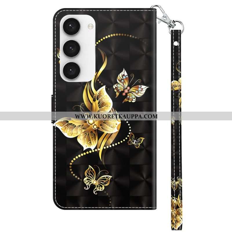 Nahkakotelo Samsung Galaxy S23 5G Suojaketju Kuori Butterflies Kultainen Hihna