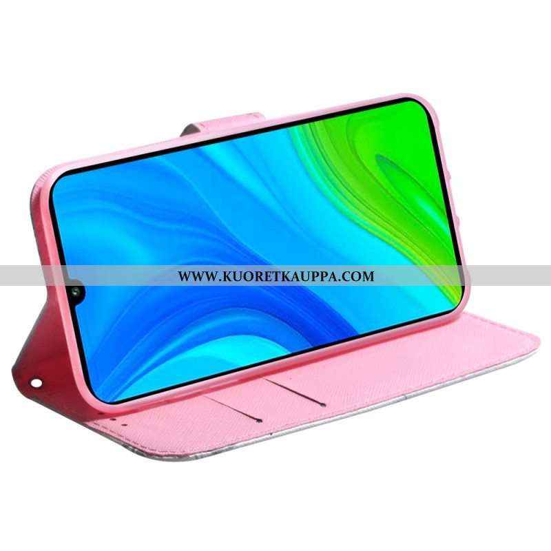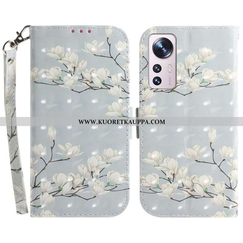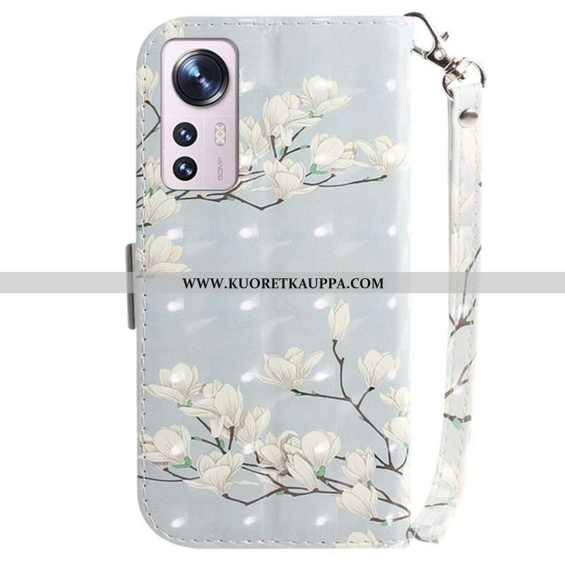 Nahkakotelo Xiaomi 12 / 12X Suojaketju Kuori Strappy Valkoiset Kukat