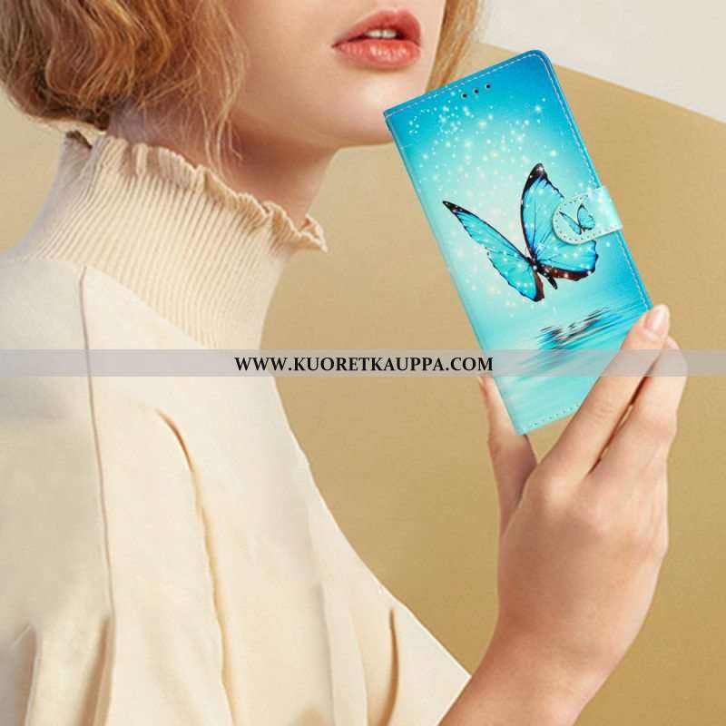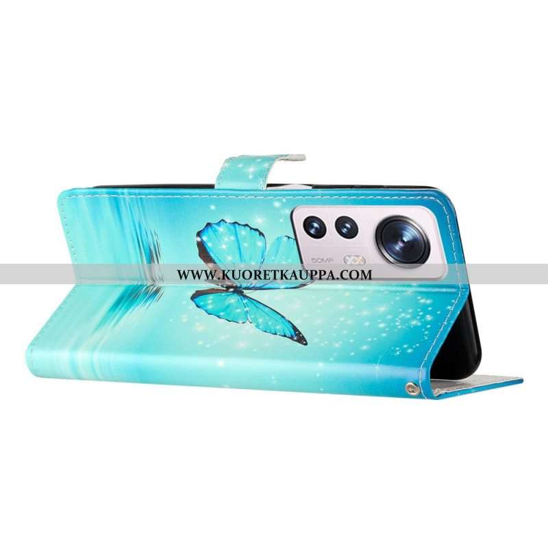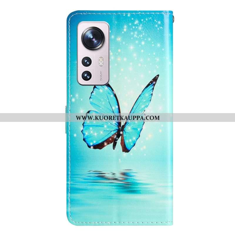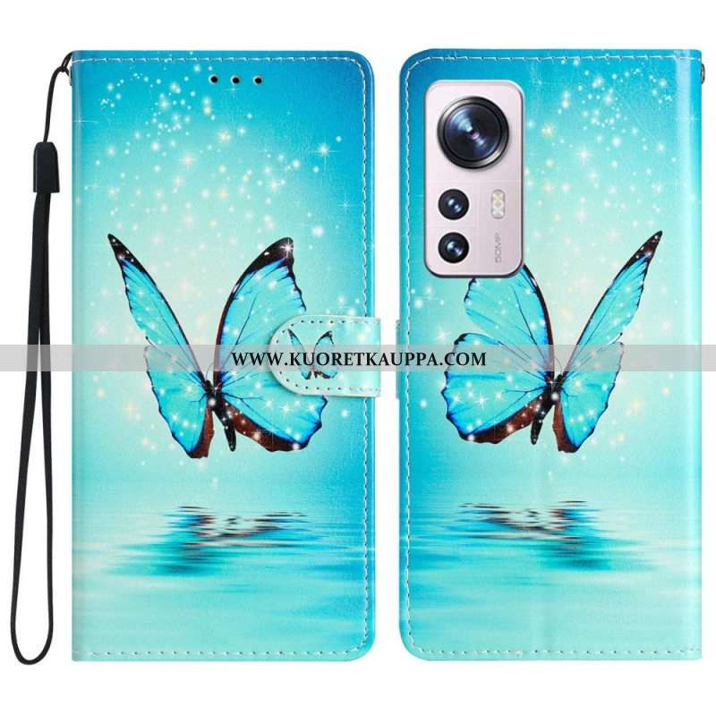 Nahkakotelo Xiaomi 12 Lite Suojaketju Kuori Siniset Perhoset Hihnalla
