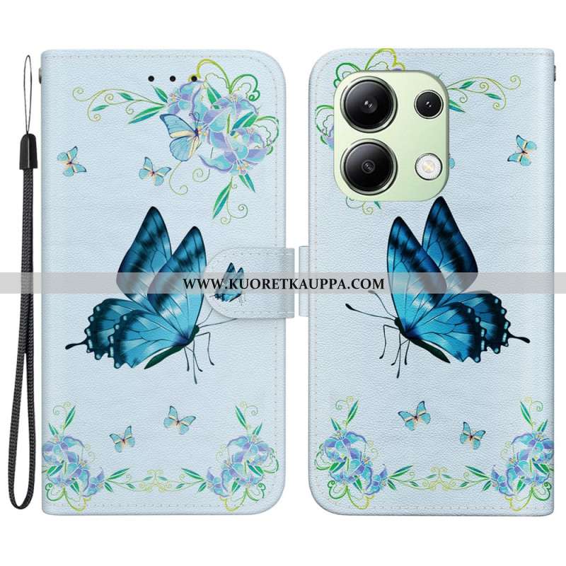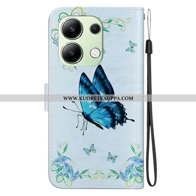 Nahkakotelo Xiaomi Redmi Note 13 4g Sininen Perhonen Ja Kukkia Hihnalla