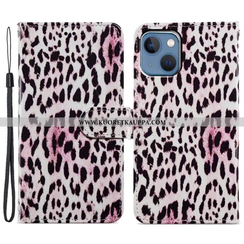 Nahkakotelo iPhone 15 Plus Suojaketju Kuori Leopard-ihoefekti Hihnalla