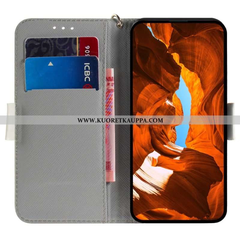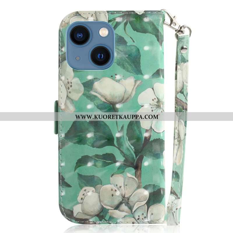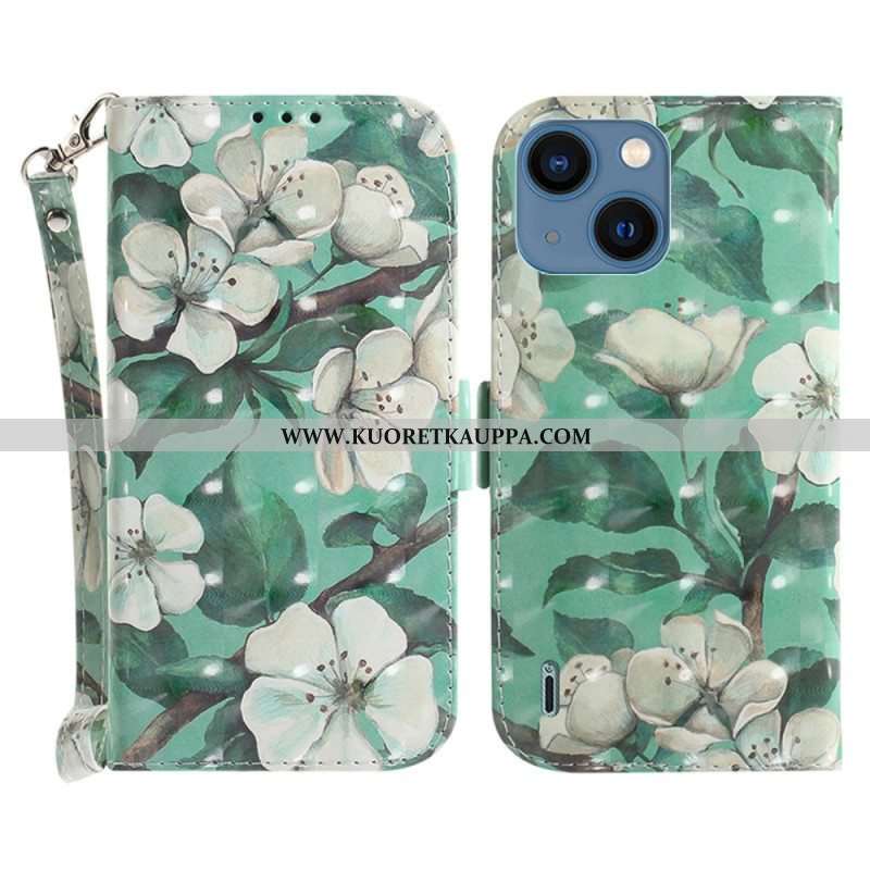 Nahkakotelo iPhone 15 Plus Suojaketju Kuori Valkoisia Kukkia Hihnalla