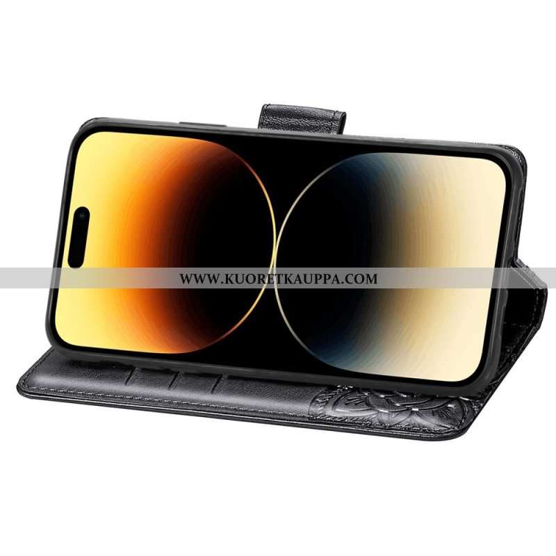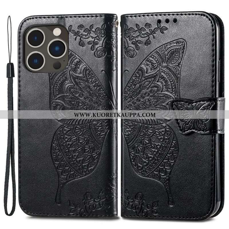 Nahkakotelo iPhone 15 Pro Max Suojaketju Kuori Barokkiperhonen Hihnalla