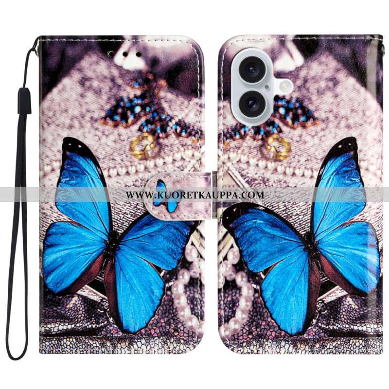 Nahkakotelo iPhone 16 Sininen Perhonen Hihnalla
